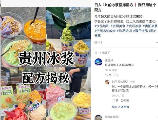 从去年开始,贵州传统冰浆开始走出区域,成为众多地摊的“顶流甜品”。在社交媒体上,不少年轻人分享自己制作冰浆摆摊的过程,更有博主称自己制作的冰浆日销百杯,周末销量更佳。