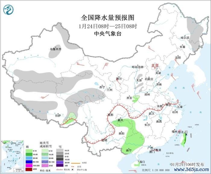 1月24日08时至25日08时,新疆东北部和南疆南部山区、西藏、青海西部和东南部、黑龙江中部等地部分地区有小雪或雨夹雪,其中,西藏南部山区、青海西南部等地部分地区有中雪;湖南西部、重庆南部、广西中东部、台湾岛大部等地部分地区有小雨,其中,台湾岛东部等地局地有中到大雨(25~45毫米)。西藏北部、内蒙古中西部、甘肃西部、宁夏、辽东半岛、山东半岛等地部分地区有4~6级风;东海北部海域有5~7级风、阵风8级,南海西南部有6~7级风、阵风8级。