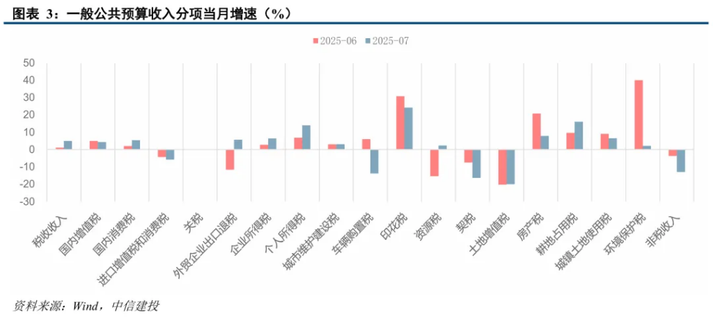 7月第二大税种企业所得税(6.4%)增速回升3.6个百分点,与7月PPI及核心CPI环比回升相印证。