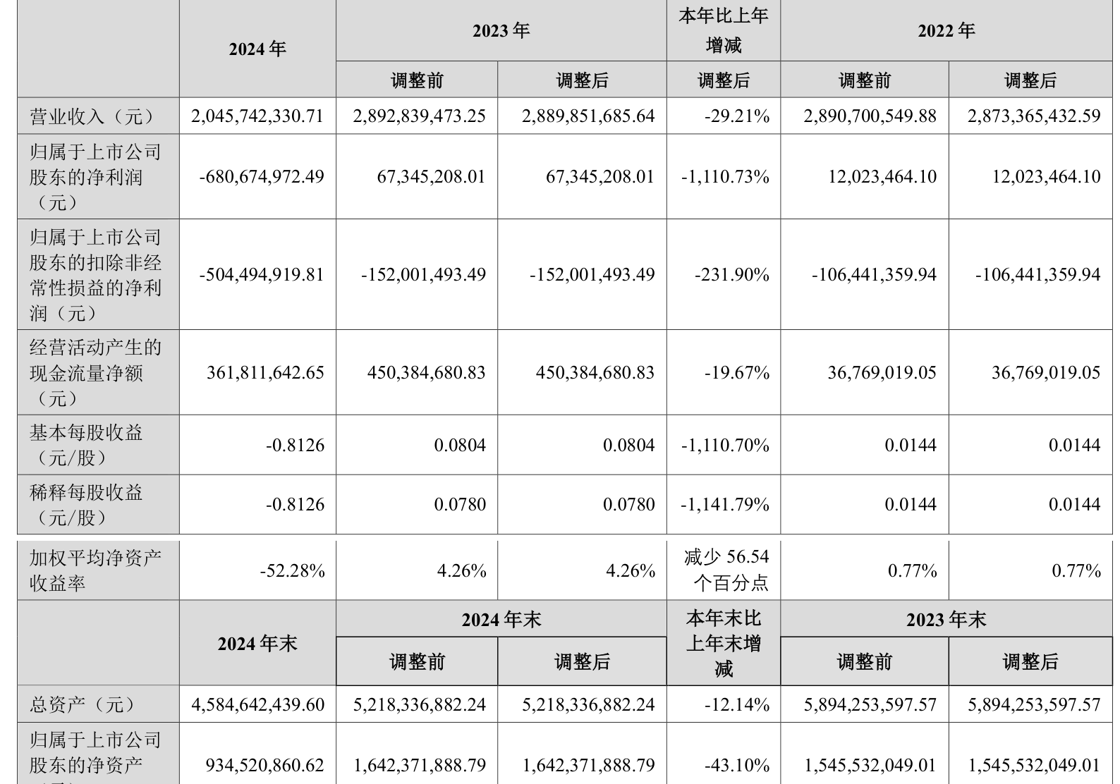 中证智能财讯皇氏集团(002329)4月25日披露2024年年度报告。2024年,公司实现营业总收入20.46亿元,同比下降29.21%;归母净利润亏损6.81亿元,上年同期盈利6734.52万元;扣非净利润亏损5.04亿元,上年同期亏损1.52亿元;经营活动产生的现金流量净额为3.62亿元,同比下降19.67%;报告期内,皇氏集团基本每股收益为-0.8126元,加权平均净资产收益率为-52.28%。