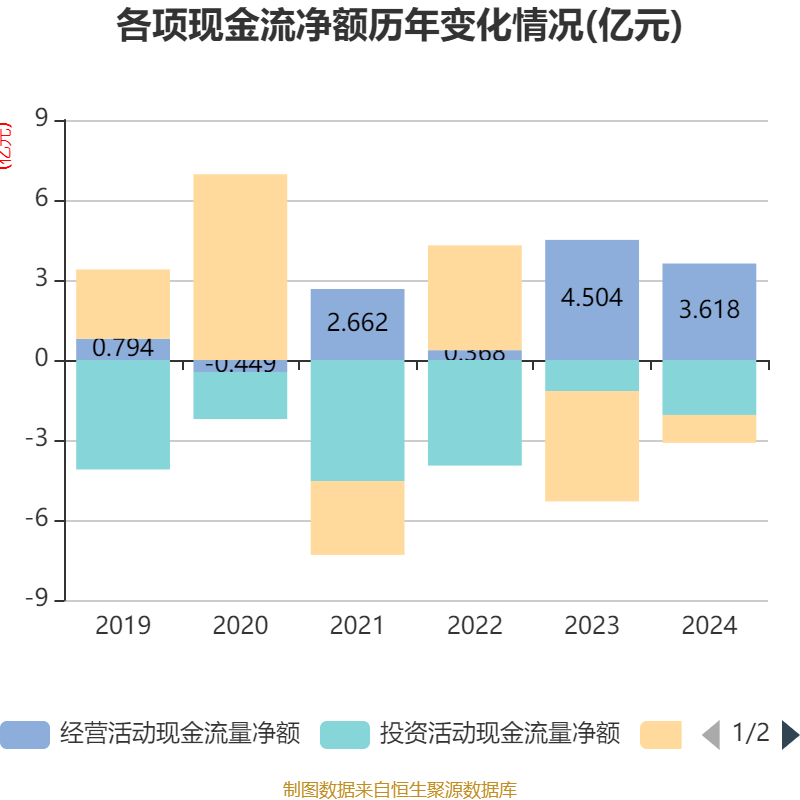 截至2024年,公司经营活动现金流净额为3.62亿元,同比下降19.67%;筹资活动现金流净额-1.05亿元,同比增加3.09亿元;投资活动现金流净额-2.06亿元,上年同期为-1.16亿元。