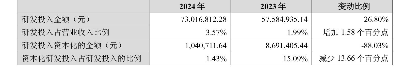2024年全年国融资管,公司研发投入金额为7301.68万元,同比增长26.8%;研发投入占营业收入比例为3.57%,相比上年同期上升1.58个百分点。此外,公司全年研发投入资本化率为1.43%。