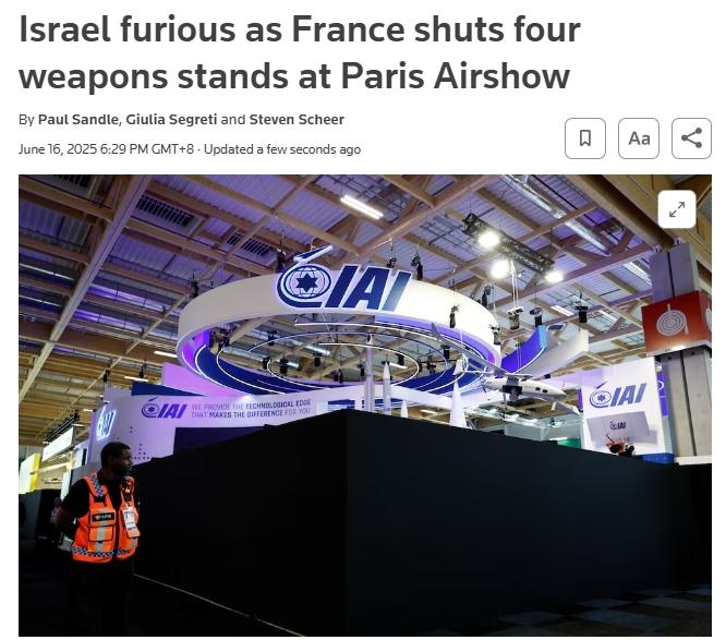 据报道,由于以色列公司拒绝移除展示的攻击性武器,法国关闭了巴黎航展上的四个主要以色列公司展位。消息人士透露,关闭指令来自法国当局。