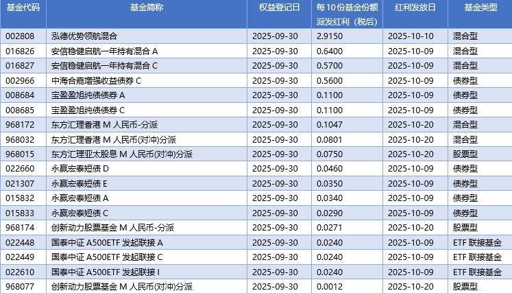 (1)09月30日新发基金共有14只,主要为债券型基金和ETF联接基金基金元宝枫资本,其中宏利嘉利债券A募集目标金额达60.00亿元;基金分红18只,多为债券型,派发红利最多的基金是泓德优势领航灵活配置混合型证券投资基金,每10份基金份额派发红利2.9150元。