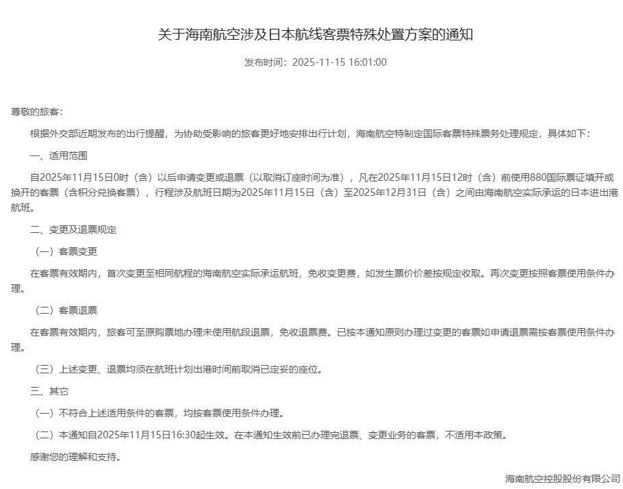 通知中明确,特殊处置方案适用范围如下:自2025年11月15日0时(含)以后申请变更或退票(以取消订座时间为准),凡在2025年11月15日12时(含)前使用880国际票证填开或换开的客票(含积分兑换客票)恒牛网,行程涉及航班日期为2025年11月15日(含)至2025年12月31日(含)之间由海南航空实际承运的日本进出港航班。