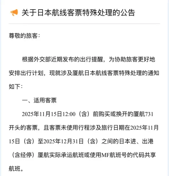 国航在通知中明确,对于在今年11月15日12时(含)前购买或换开产生新票号的国航999开头的客票(包括里程奖励客票);客票未使用行程涉及旅行日期为2025年11月15日(含)至2025年12月31日(含)之间东京、大阪、名古屋、福冈、仙台、广岛、札幌、冲绳进出港的国航实际承运航班和挂CA航班号的代码共享航班;在2025年11月15日0时(含)以后申请客票变更或退票(以取消客票订座时间为准)。在客票有效期内,首次变更免收变更手续费,但需收取子舱位差价及淡旺季差价,再次变更需依据客票使用条件办理。在客票有效期内,可以办理未使用航段退票,免收退票手续费。