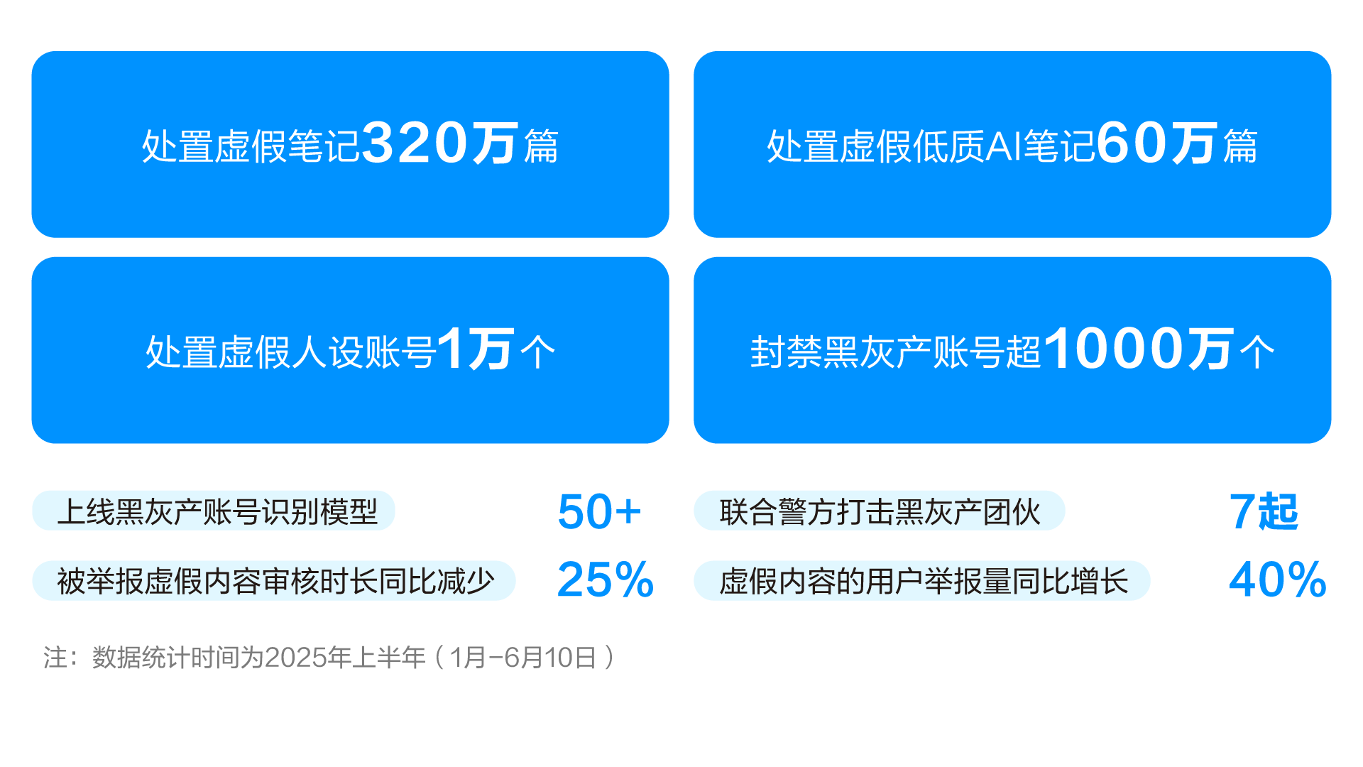 此外,小红书还不断加大对AIGC识别模型的研发投入,进一步提高识别精准度,减少虚假低质AI内容的曝光。同时,平台对AIGC生成内容做主动标识工作,提升信息透明度。半年共处置治理虚假低质AI笔记60万篇。