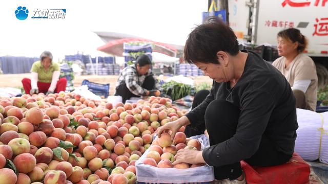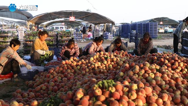 6月22日凌晨五点,天刚蒙蒙亮,种植户已经把一车车白里透红的桃子运送到市场。过称、分拣、装车,不到1个小时,村民吴峰峰家的800斤桃子就坐上了运往陕西的冷链车。