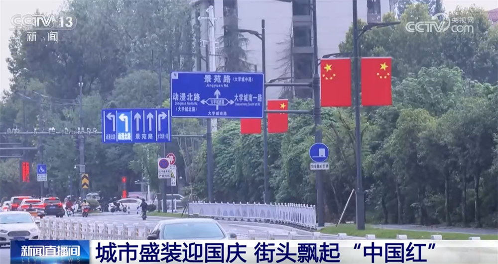 迎风飘扬的五星红旗与葱郁的街道绿树交织,构成了一道亮丽的风景线。一抹抹跃动的“中国红”扮靓了城市街景,也点燃了人们内心深处的爱国热情。